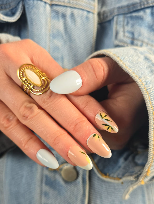 Une pose lumineuse et délicate où les tons doux de bleu ciel et de nude se mêlent à des accents floraux subtils. Les détails végétaux, relevés par des touches de jaune ensoleillé, évoquent un jardin baigné de lumière. Chaque ongle devient une note fraîche, élégante et parfaitement dans l’air du temps.